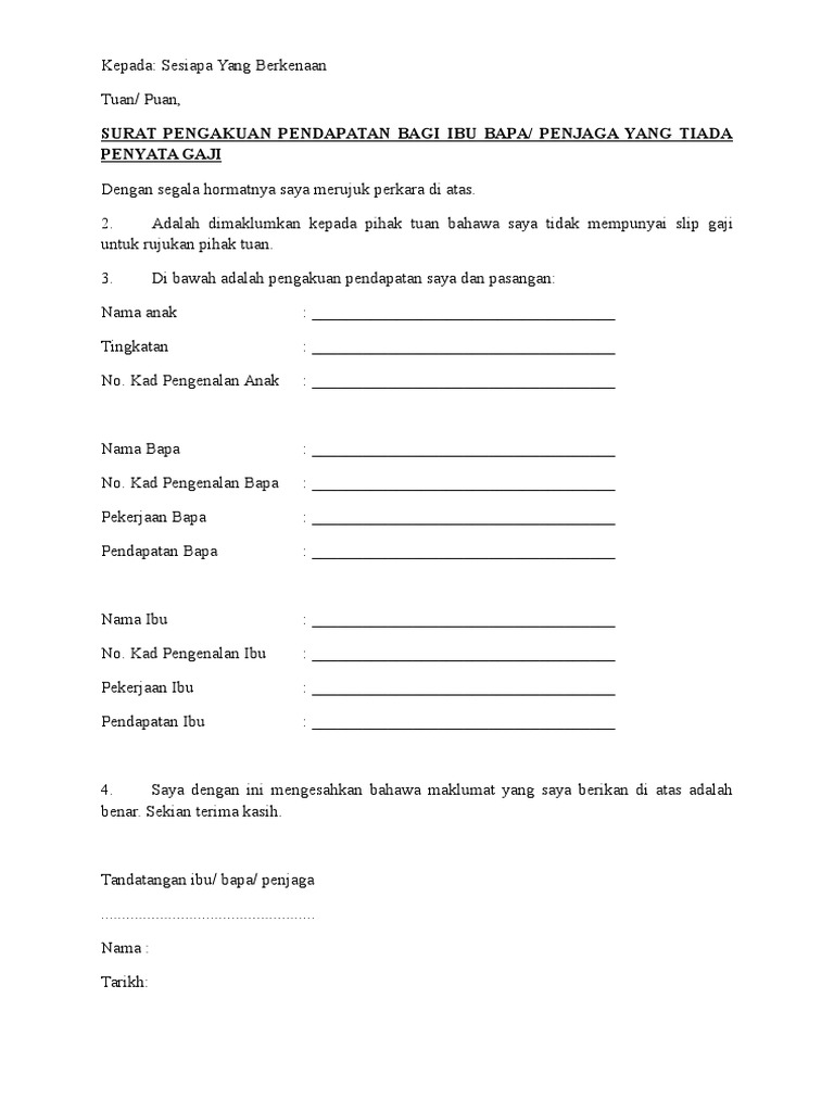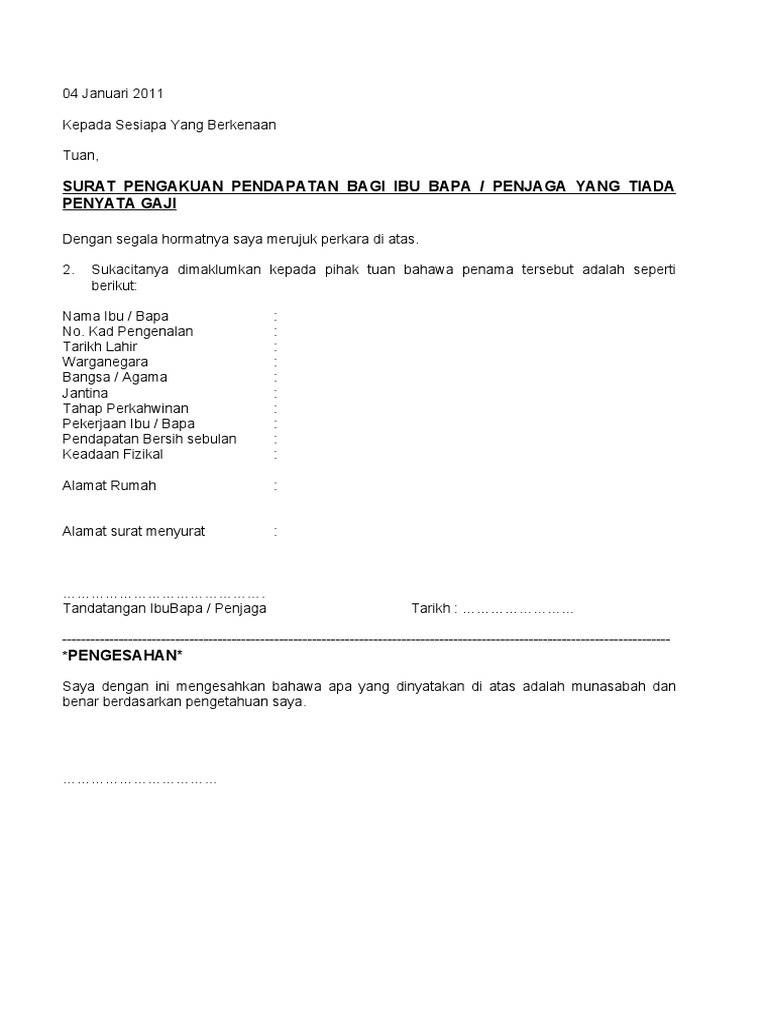 Diunggah oleh informasi dokumen bagikan dokumen ini opsi berbagi. Surat pengesahan ibu bapa tanpa penyata gaji tq lebel surat akuan pendapatan bagi ibu bapa penjaga. Lazimnya individu yang bekerja sendiri tidak mempunyai penyata pendapatan atau slip gaji yang dikeluarkan oleh pihak majikan.